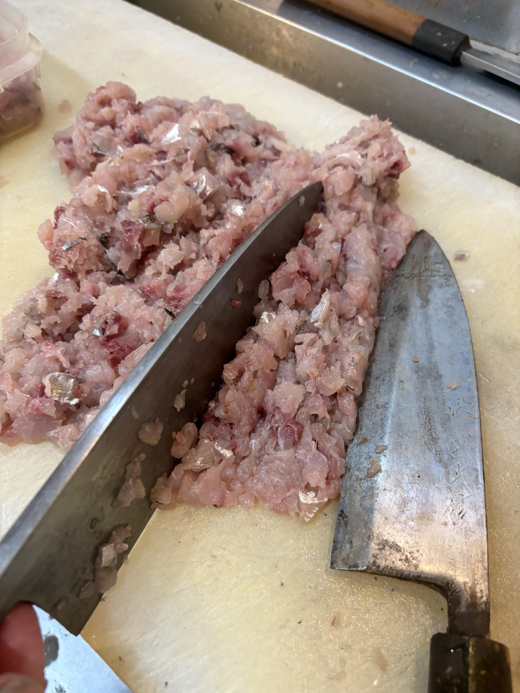 皮を引いて、2本の出刃庖丁を使い、