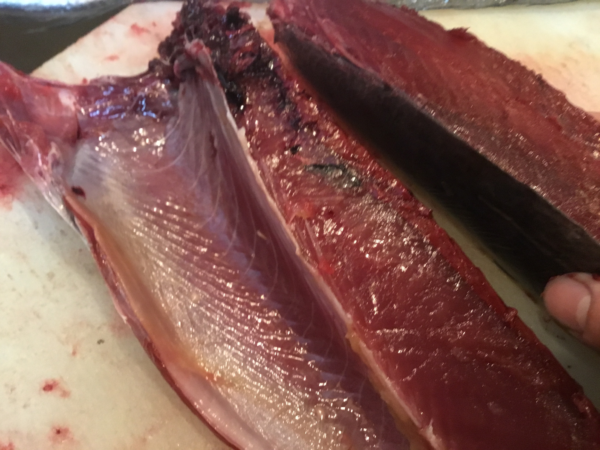 秋の脂がしっかりのる、三陸から千葉で水揚げされる鰹と違い、
