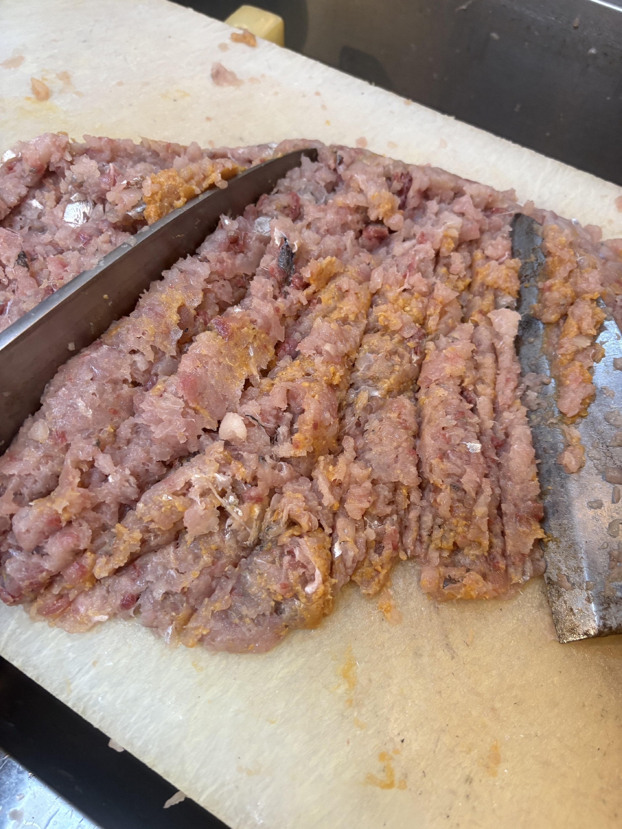 皮を引いて、2本の出刃庖丁を使い、